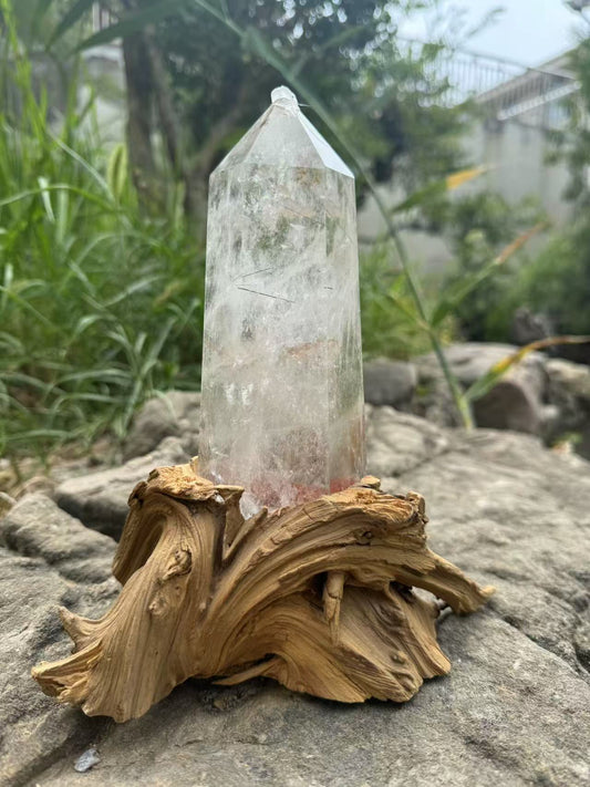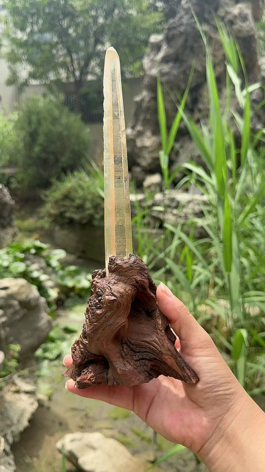 A00205 Rare natural highest quality lemurian quartz with customed wooden holder