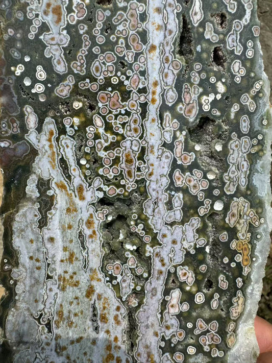 A00206 Rare natural highest quality green druzy geode 8th-ven ocean jasper slab with pink eyes