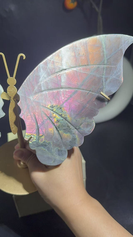 A00224 Rare natural highest quality strong purple sun flash labradorite butterfly wings with custom-made gold matal holder